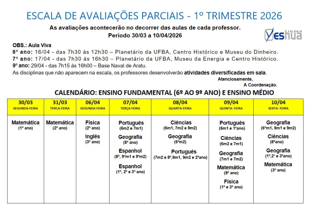 Senhores pais e/ou responsáveis, informamos que está disponível para consulta a escala parcial de avaliações do 1º Trimestre.